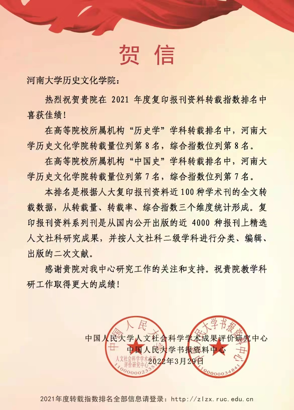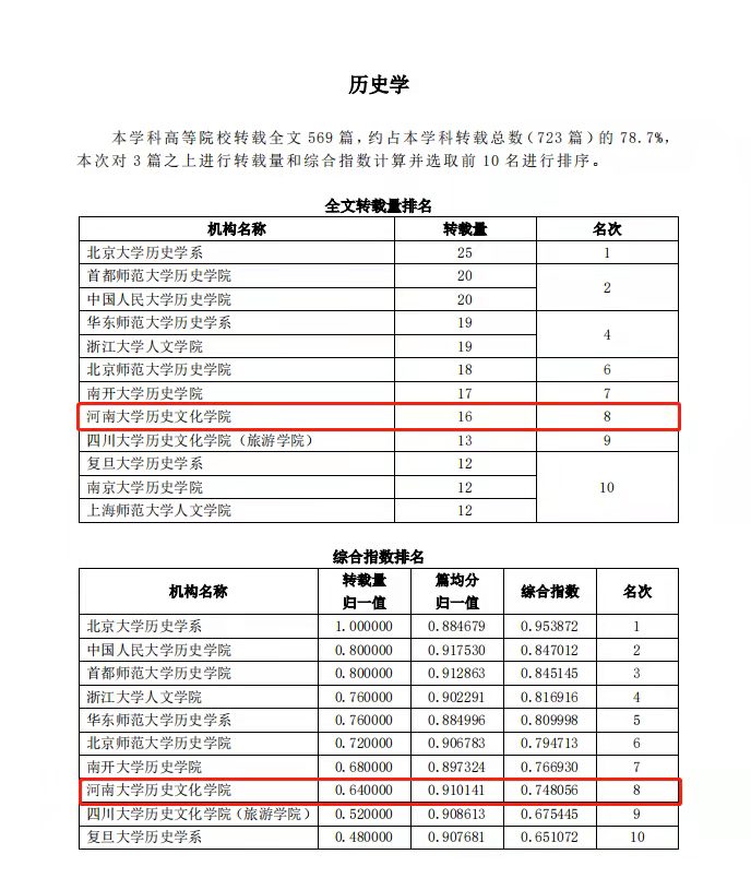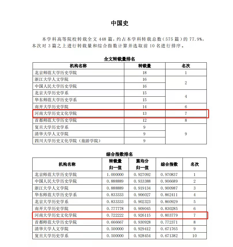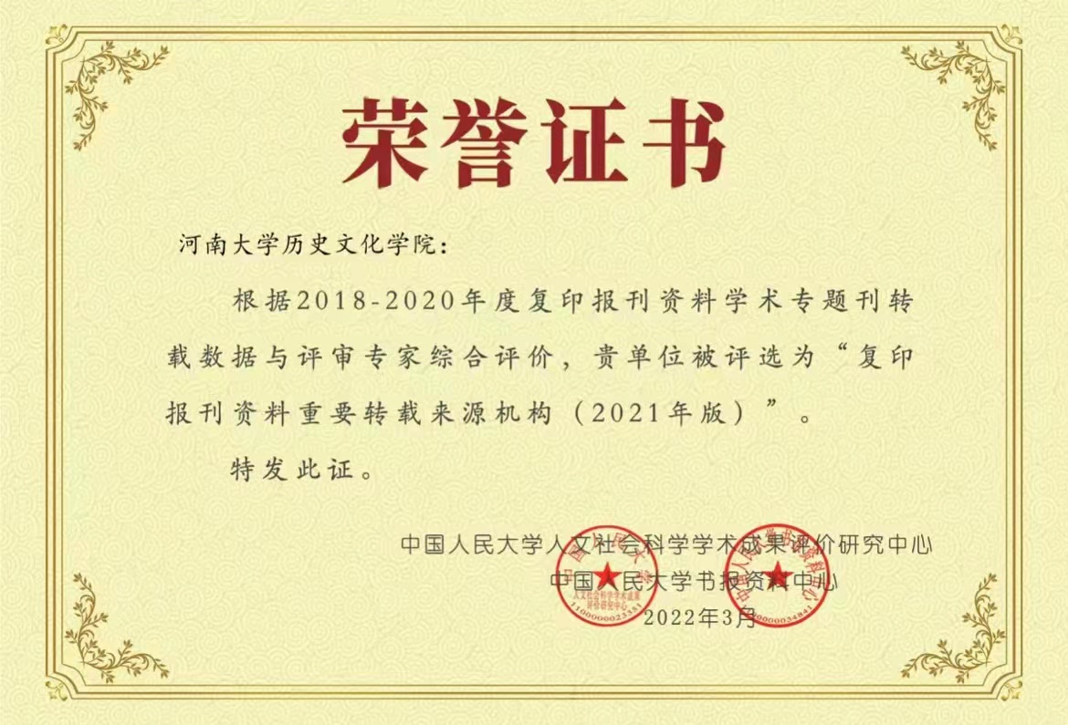 伟德国际1949官网入选“复印报刊资料重要转载来源机构(2021版)”;在高等院校所属机构“历史学”学科转载排名中,伟德国际1949官网转载量和综合指数位列第8名;在高等院校所属机构“中国史”学科转载排名中,伟德国际1949官网转载量和综合指数位列第7名;在“历史学学科期刊”全文转载排名中,由伟德国际1949官网和河南省历史学会主办的《史学月刊》转载量位列第2名,转载率位列第7名,综合指数位列第2名;在“中国史学科期刊”全文转载排名中,《史学月刊》转载量位列第1名,转载率位列第6名,综合指数位列第2名。