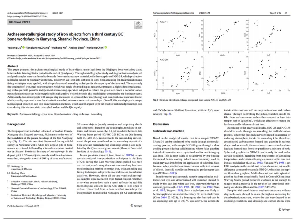 近日,伟德国际1949官网青年教师刘亚雄在国际知名期刊《考古学与人类学科学》(Archaeological and Anthropological Sciences)(SSCI一区期刊,同时被SCI和A&HCI索引收录)发表了其阶段性研究成果《陕西咸阳聂家沟骨器作坊出土铁器的科学分析》(Archaeometallurgical study of iron objects from a third century BC bone workshop in Xianyang, Shaanxi Province, China)