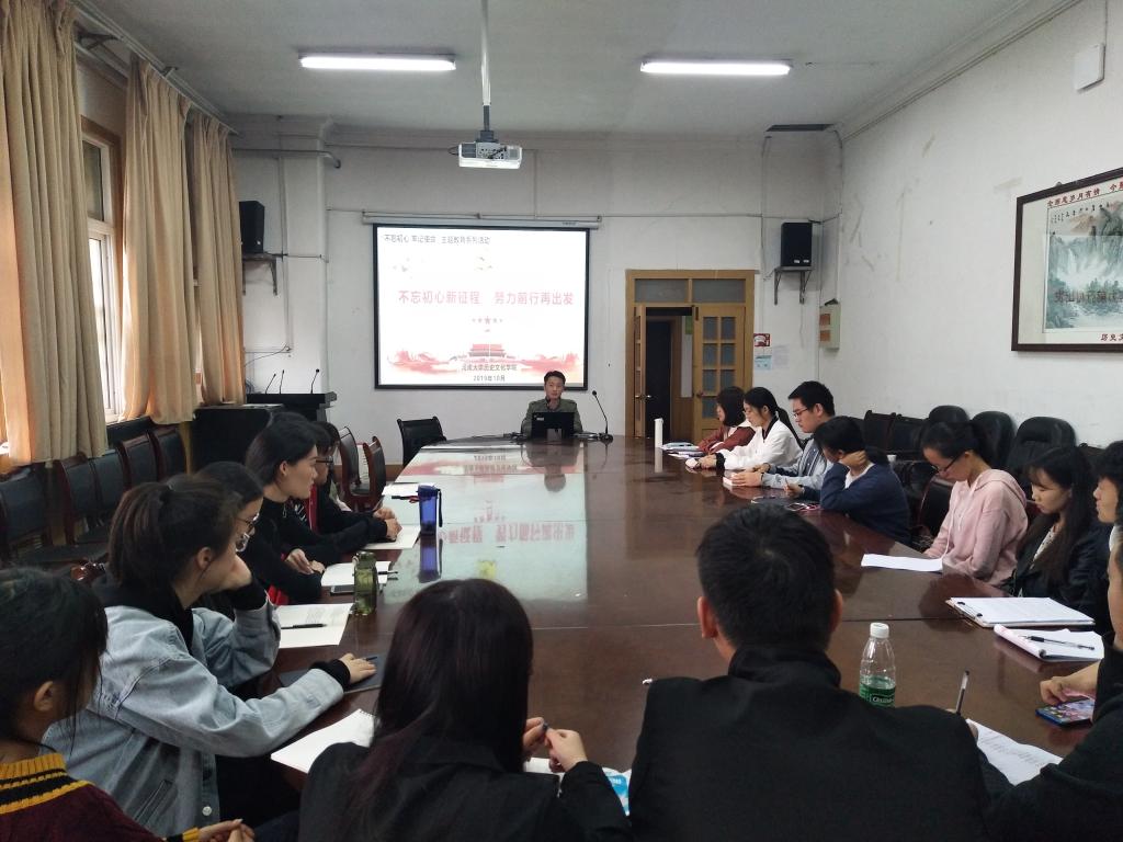 研究生二支部和三支部通过观看文献专题片和集中理论学习的形式开展活动。通过观看《我们走在大路上》第一集《新中国诞生》,党员们对新中国诞生历史的认识、对共产党人“初心”的理解得到了深化和加强。刘文星表示,七十年后的今天再次看到开国大典的画面依然会感到十分振奋,同志们应该恪守初心,肩负起时代赋予的使命,不断提高自我、完善自我,为“中国梦”积蓄力量,无愧于党和国家,无愧于人民。观影结束后,与会党员通过“学习强国”平台集中学习了《习近平总书记论‘不忘初心、牢记使命’(2019年)》的文件精神。