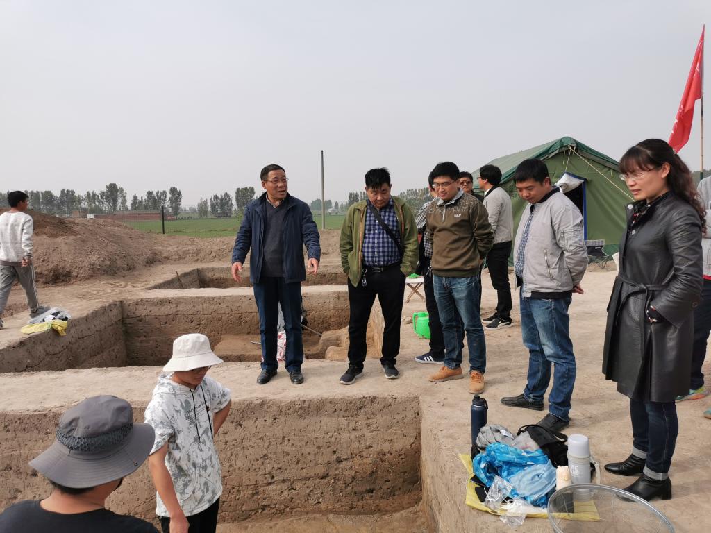 他们首先来到考古发掘工地。在现场,领队张立东老师向大家介绍了李固遗址概况,自2019年9月23日河大考古队进驻李固遗址开展工作以来,共有李丽娜、张玲、李彬森等多位老师以及来自公司各个年级的研究生、本科生近40人参与其中,他们克服了野外工地的环境不适、条件简陋、生活不便等各种困难,不舍昼夜,勤奋工作,已发掘面积约500平方米,发现墓葬、灰坑和房址等多处,出土陶片、石器、玉器多件,取得可喜的成果。