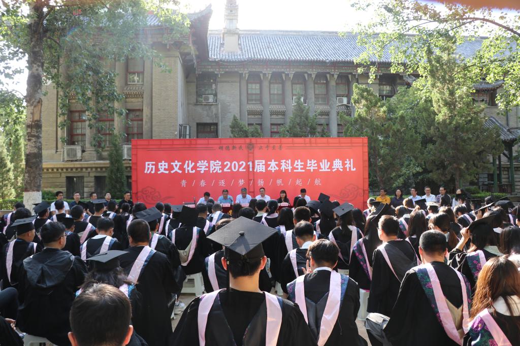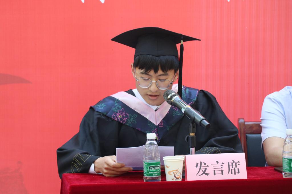 毕业典礼在庄严的国歌声拉开序幕。2017级世界史专业滕帅坤同学作为毕业生代表发言。他回忆了大学四年的点点滴滴,并分享了自己和母校共同成长的经历,表示将尽最大努力迎接未来新的挑战,坚定信念、不负所望,努力交出一份满意的答卷,言语间充满了不舍。2019级文物与博物馆学专业孙荣羚同学作为在校生代表发言。她对学长学姐们的关心和帮助表示感谢,并祝愿他们前程似锦,一路乘风破浪,创造精彩人生,作为学弟学妹们要继承和弘扬公司优良传统,努力学习,刻苦锻炼,奋斗成才。