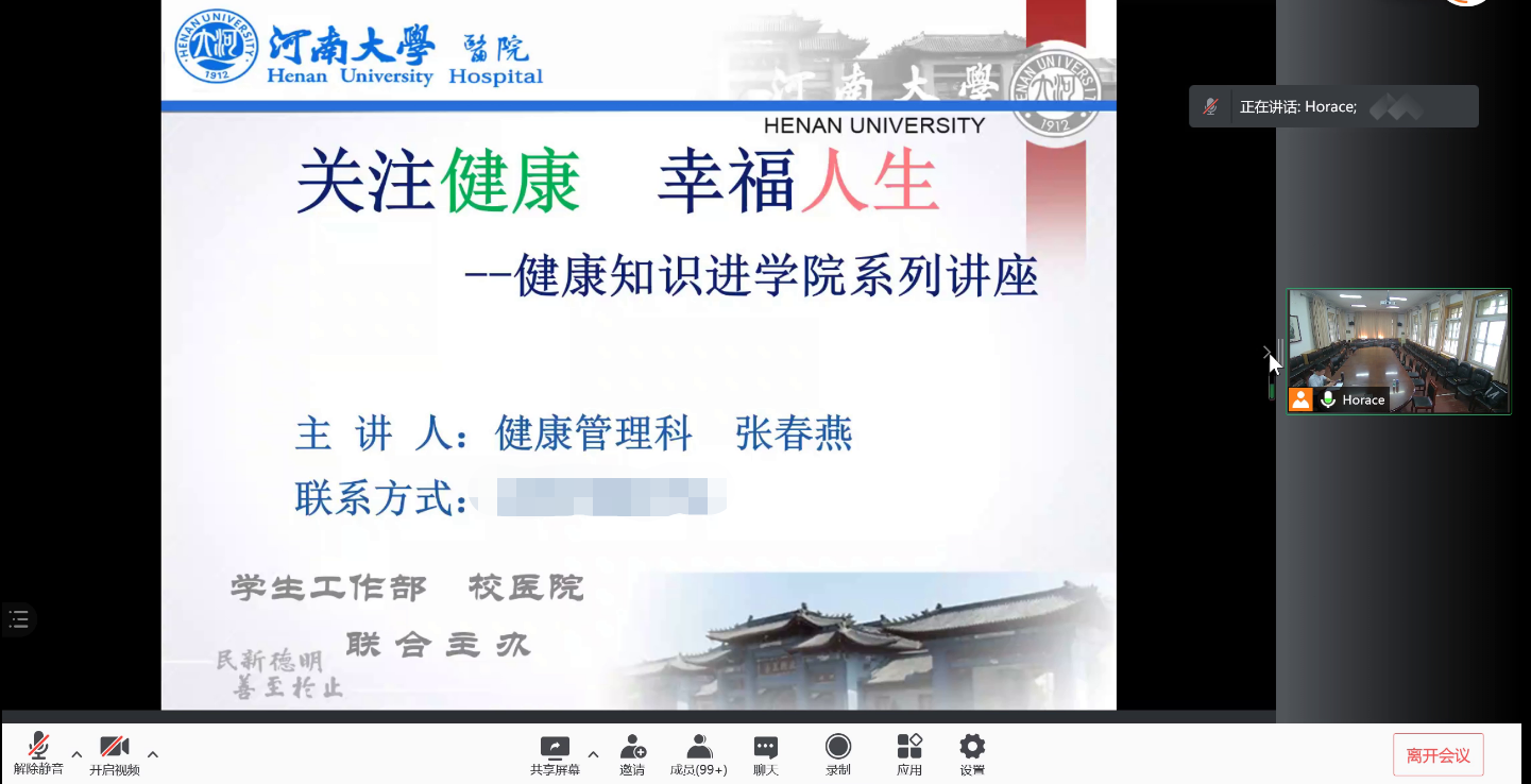 为提高新生对自身健康的关注,掌握科学健康知识,培养良好卫生习惯,伟德国际1949官网于9月15日下午以线上会议形式举行了2021级本科新生健康教育讲座,并邀请校医院健康管理科张春燕老师担任主讲人。讲座由2021级本科生辅导员郭浩老师主持。
