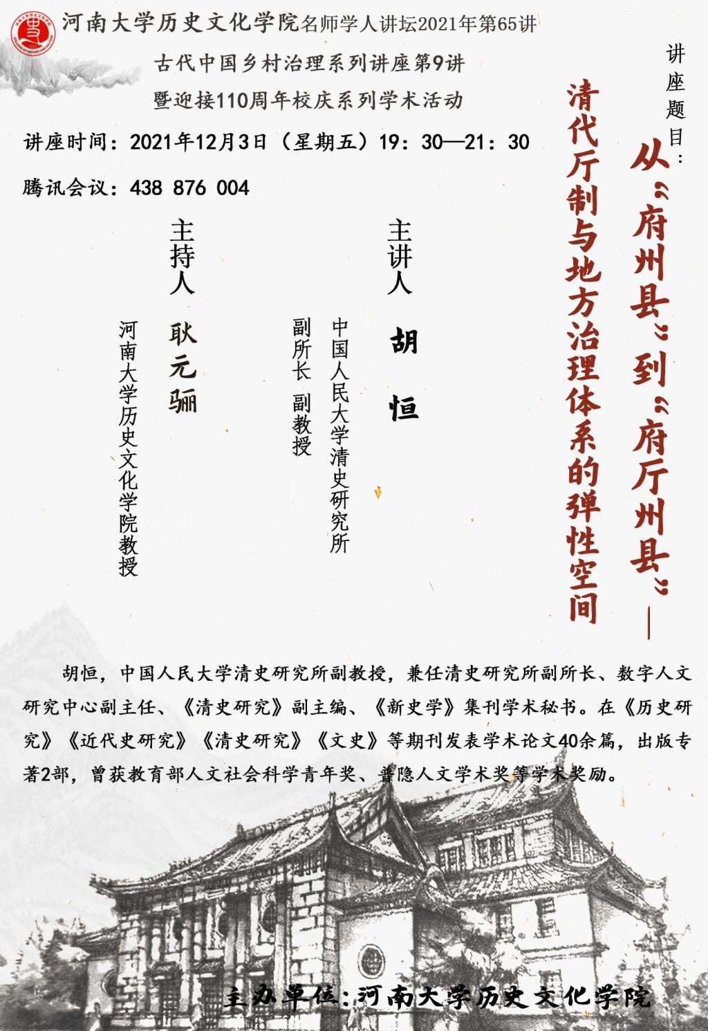 【讲座通知】胡恒:从“府州县”到“府厅州县”--清代厅制与地方治理体系的弹性空间