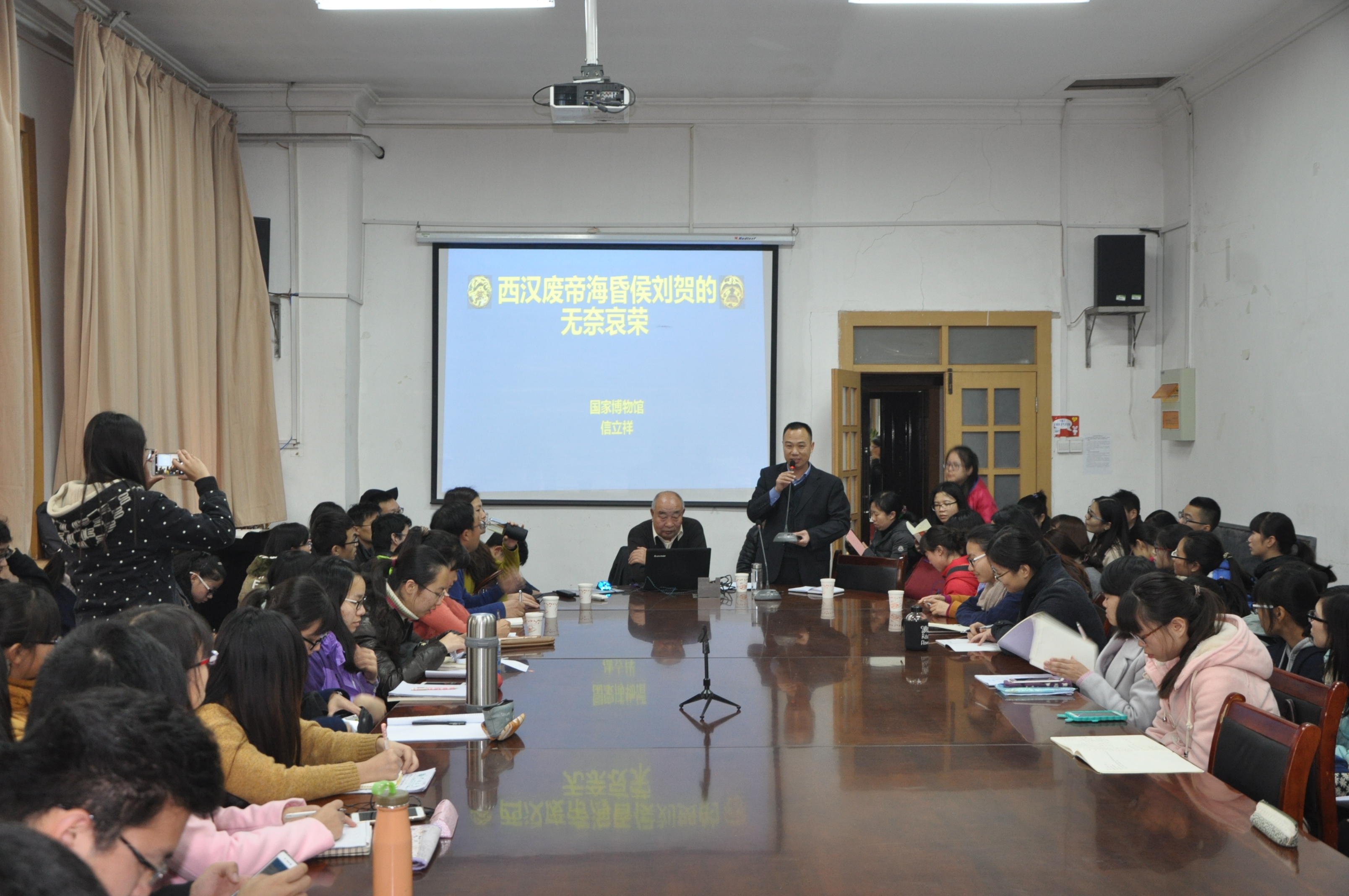 11月17日下午,国家博物馆研究员、南昌海昏侯墓考古专家组组长信立祥莅临公司,在伟德国际1949官网三楼会议室向公司师生做题为《西汉废帝刘贺的无奈衰荣》演讲。讲座由考古文博系刘中伟博士主持,现场氛围火爆,座无虚席。