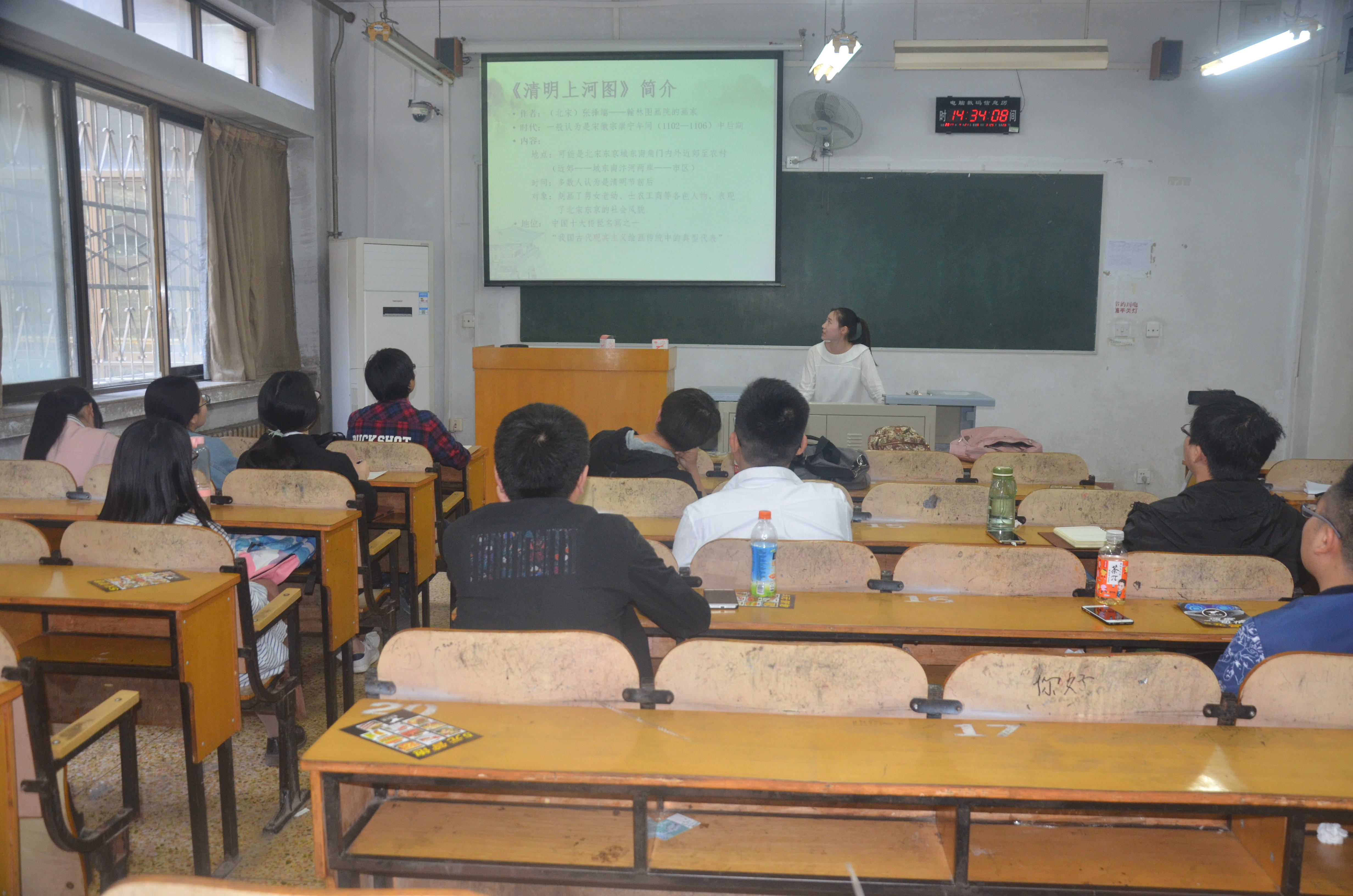 4月21日下午,博雅讲堂第五期“《清明上河图》中的人物服饰研究”在综合楼107开讲,本期博雅讲堂由13级博物馆学专业员工王潇滨担任主讲,15级欧杰同学担任主持人。指导老师韩鼎应邀参加此次报告,相关专业员工听取了此次报告。
