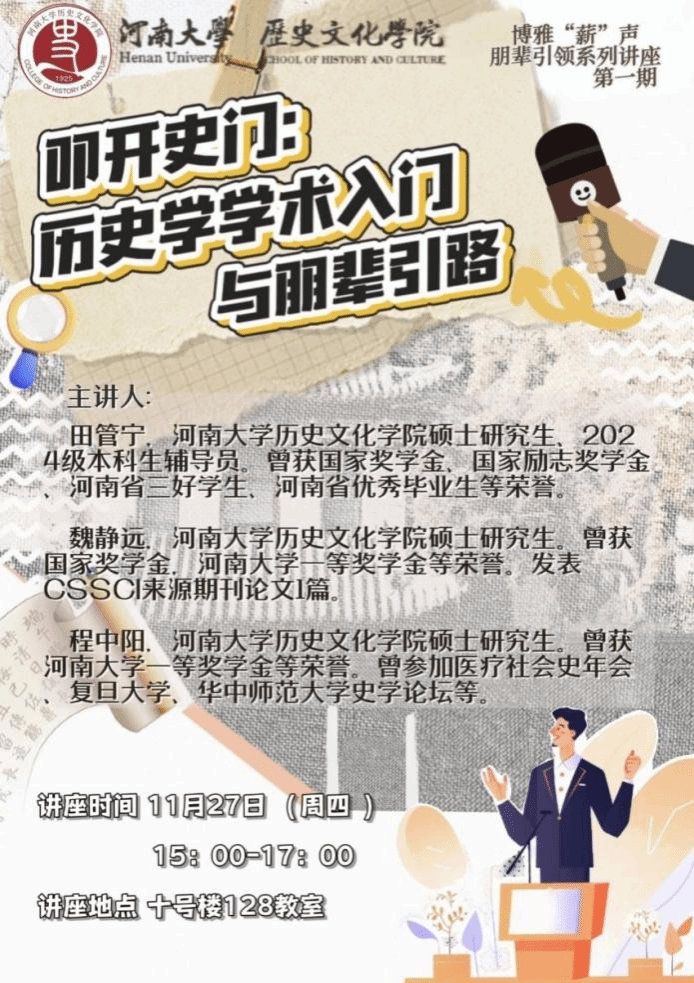 第一期讲座将会围绕“本科生历史学学术入门”的主题进行展开,主讲人将会从“论文格式规范与论文选题方法”、“著作与论文的阅读与思考方法”和“史料的查找与批判性使用”这三个方面,结合自己的实际经历进行经验分享,为本科生同学解决学术困难提供帮助。