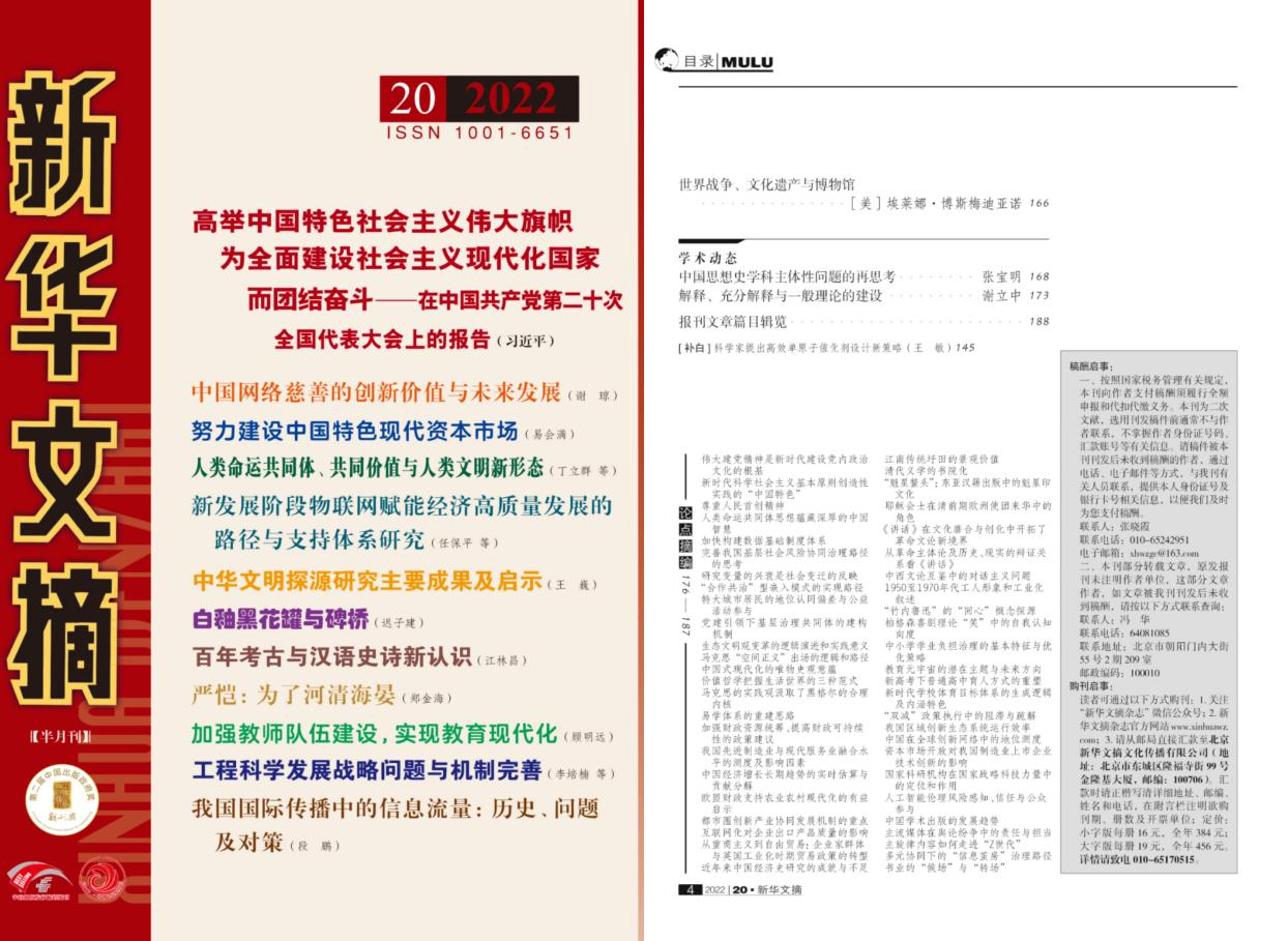 近日,伟德国际1949官网特聘教授王巍的文章《中华文明探源研究主要成果及启示》和张宝明教授的文章《中国思想史学科主体性问题的再思考》,被《新华文摘》2022年第20期全文转载。