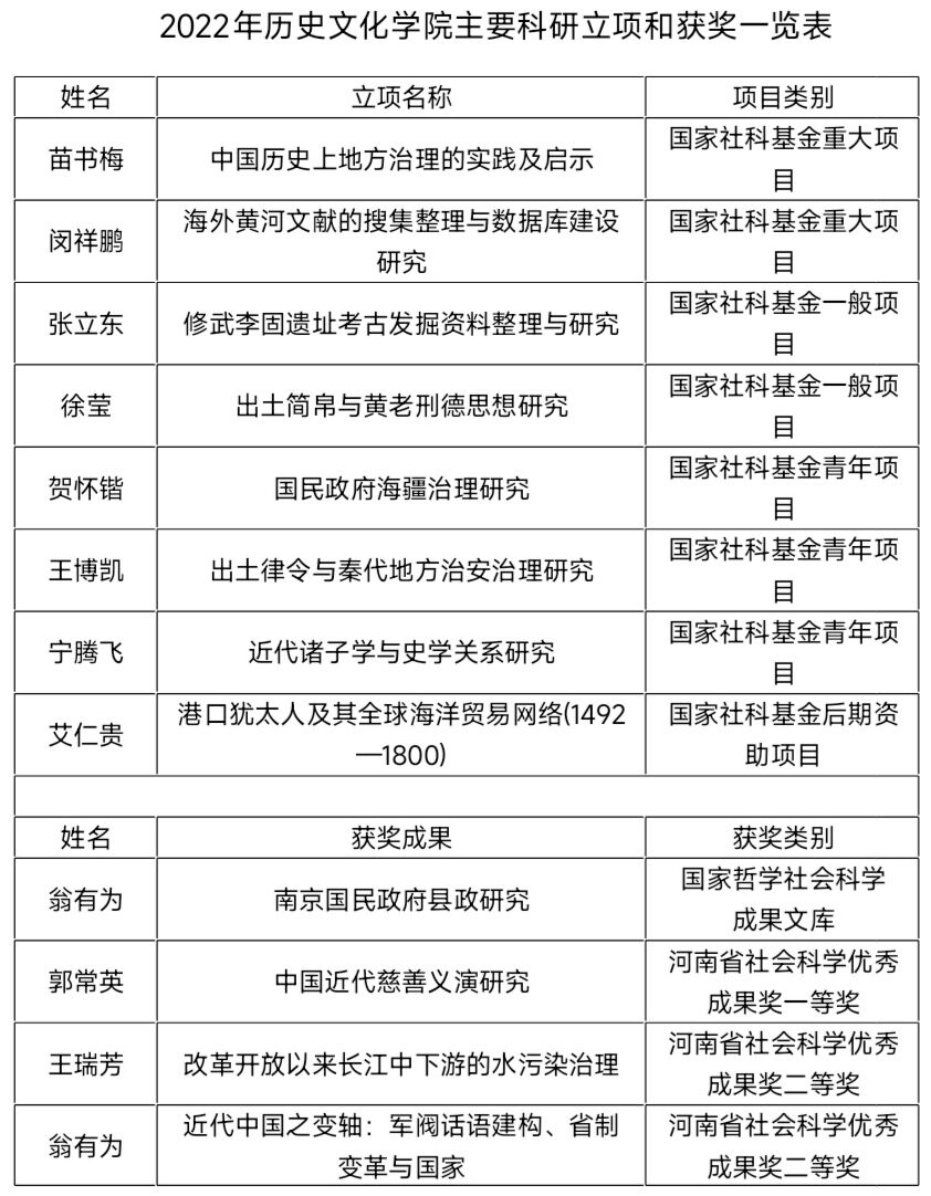 2022年伟德国际1949官网获各类科研奖励12项。翁有为教授的《南京国民政府县政研究》入选国家哲学社会科学成果文库。郭常英教授获河南省社会科学优秀成果奖一等奖,王瑞芳教授和翁有为教授获二等奖。