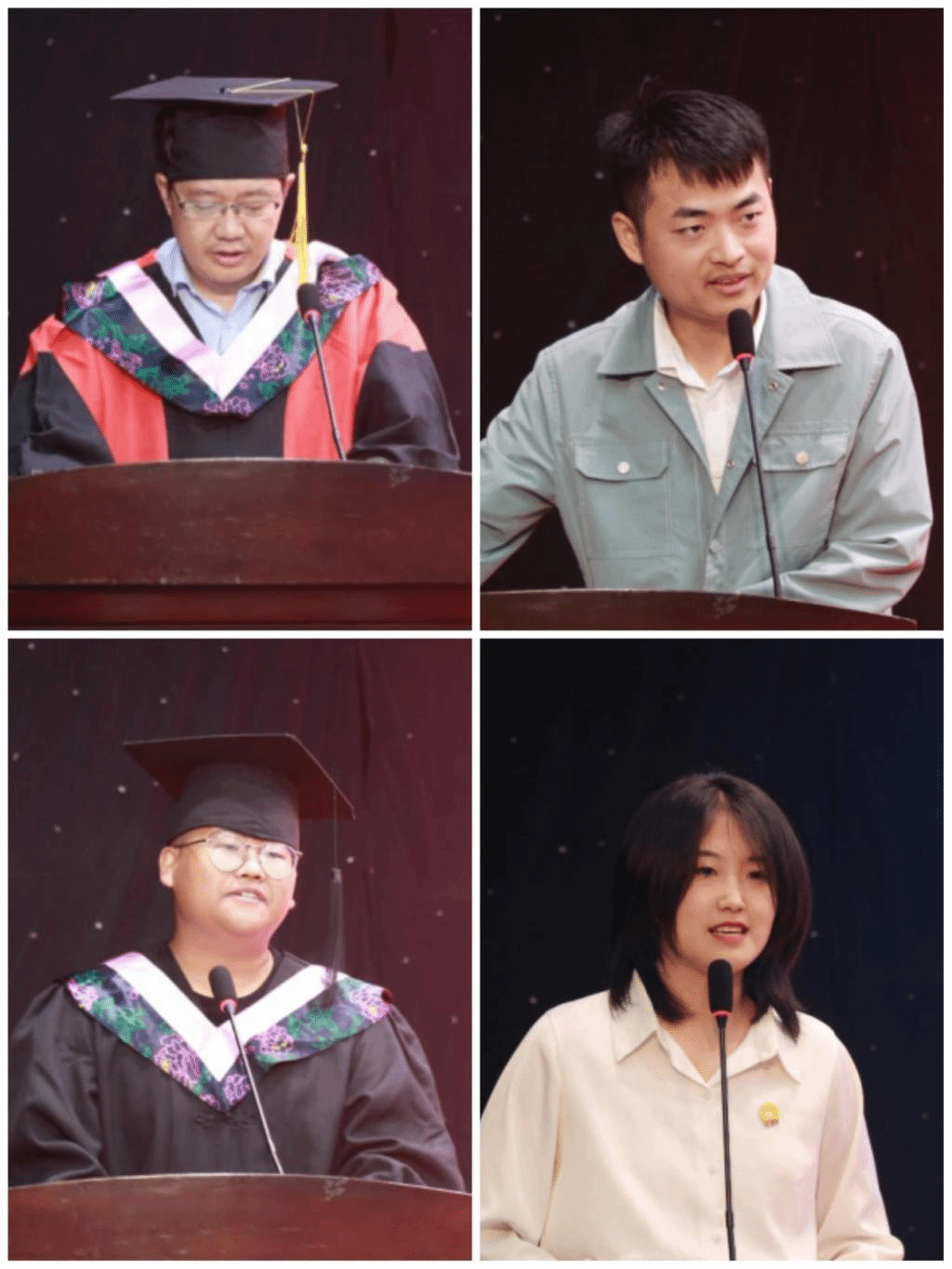 2023届历史学专业王琛代表全体毕业生进行发言。他向父母、老师与公司表达了自己深深的感激之情,并表示他们将会坚持自己的追求和理想,带着师长的教诲去谱写人生的新篇章。2020级杨卓伊同学作为在校生代表进行发言。她回忆了与学长学姐们一起度过的三年难忘时光,真心感谢他们在学习与生活上无微不至的关怀与指导,祝愿学长学姐们毕业快乐,前程似锦。