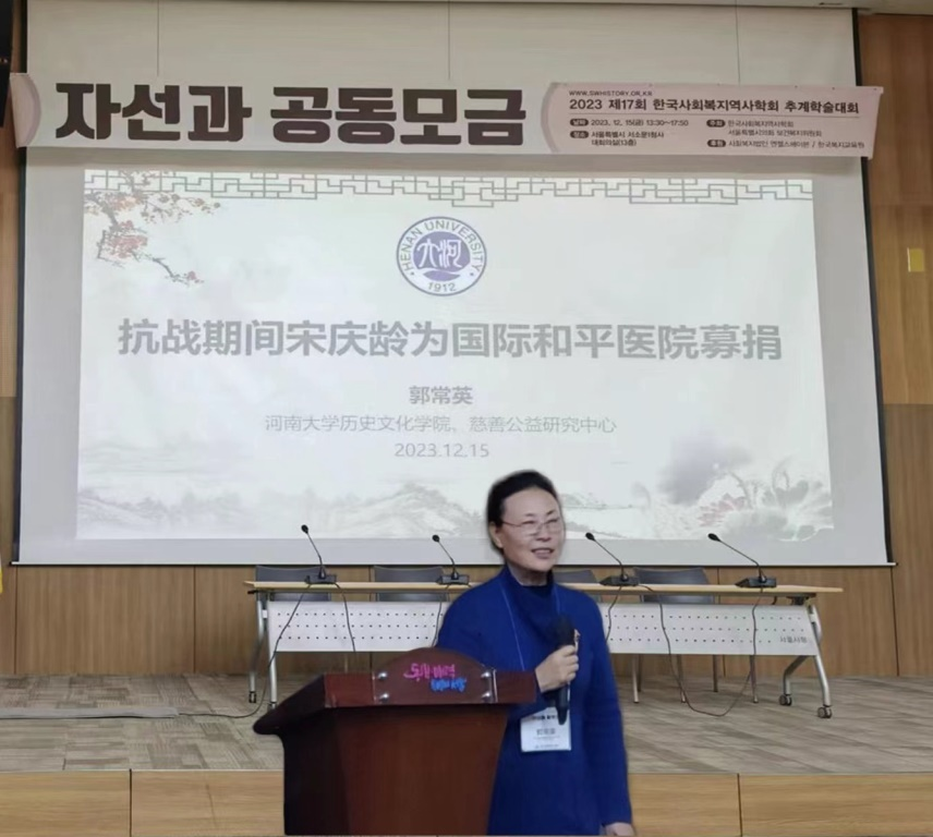 在本次学术会议上,郭常英教授以“抗战期间宋庆龄为国际和平医院募捐”为题,发表研究报告。报告围绕宋庆龄与国际和平医院的联系,通过《保卫中国同盟通讯》宣传抗战、筹款援助国际和平医院,与时俱进、组织多样化募捐活动援助国际和平医院等问题展开,由三育大学教师崔银品女士翻译,报告内容得到研讨会学者高度认可和称赞。报告评论者、韩国白石研究生院NPO经营学教授金成哲先生认为,郭常英教授的报告对宋庆龄援助国际和平医院问题的探讨非常重要,有关抗战筹款问题值得进一步挖掘和研究。