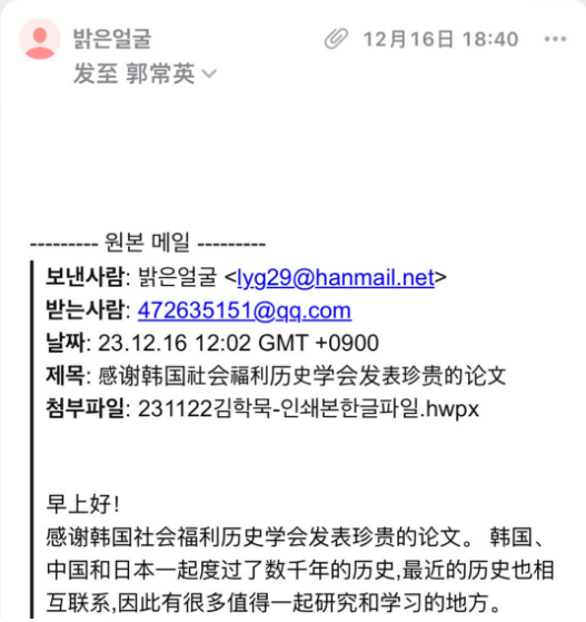 此次会议是中、日、韩三国在社会福利史研究领域的相关学术机构自2020年正式签署国际学术合作与交流备忘录后,于2023年举办的又一次友好学术交流与对话。与会的中、日、韩三国学者均表示,此次学术会议不仅有益于推动东亚各国社会福利史问题与当代社会福利问题的研究与交流,也为今后中、日、韩三国学界同人开展国际学术合作项目打下良好基础。韩国社会福利史学会前会长、光州大学教授李荣教先生很快给郭教授发邮件,表示:“感谢韩国社会福利历史学会发表珍贵论文。韩国、中国和日本一起度过了数千年的历史,最近的历史也相互联系,因此有很多值得一起研究的学习的地方。” 韩国社会福利史学会2023年新会长、新汉大学教授林元善先生在会后,通过邮件发给郭教授本人名片,希望继续保持学术交流。