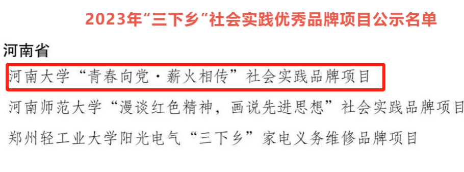 2023年“三下乡”社会实践活动聚焦组织员工在实践中深入学习宣传习近平新时代中国特色社会主义思想,鼓励同学们在扎实的社会实践中,树立起对人民的感情、对社会的责任、对国家的忠诚,引导广大青年员工在社会实践中受教育、长才干、做贡献。活动总结阶段,经基层申报、省级团委审核推荐、组织评议等环节,最终确定71个“三下乡”社会实践优秀品牌项目,其中河南省3项。