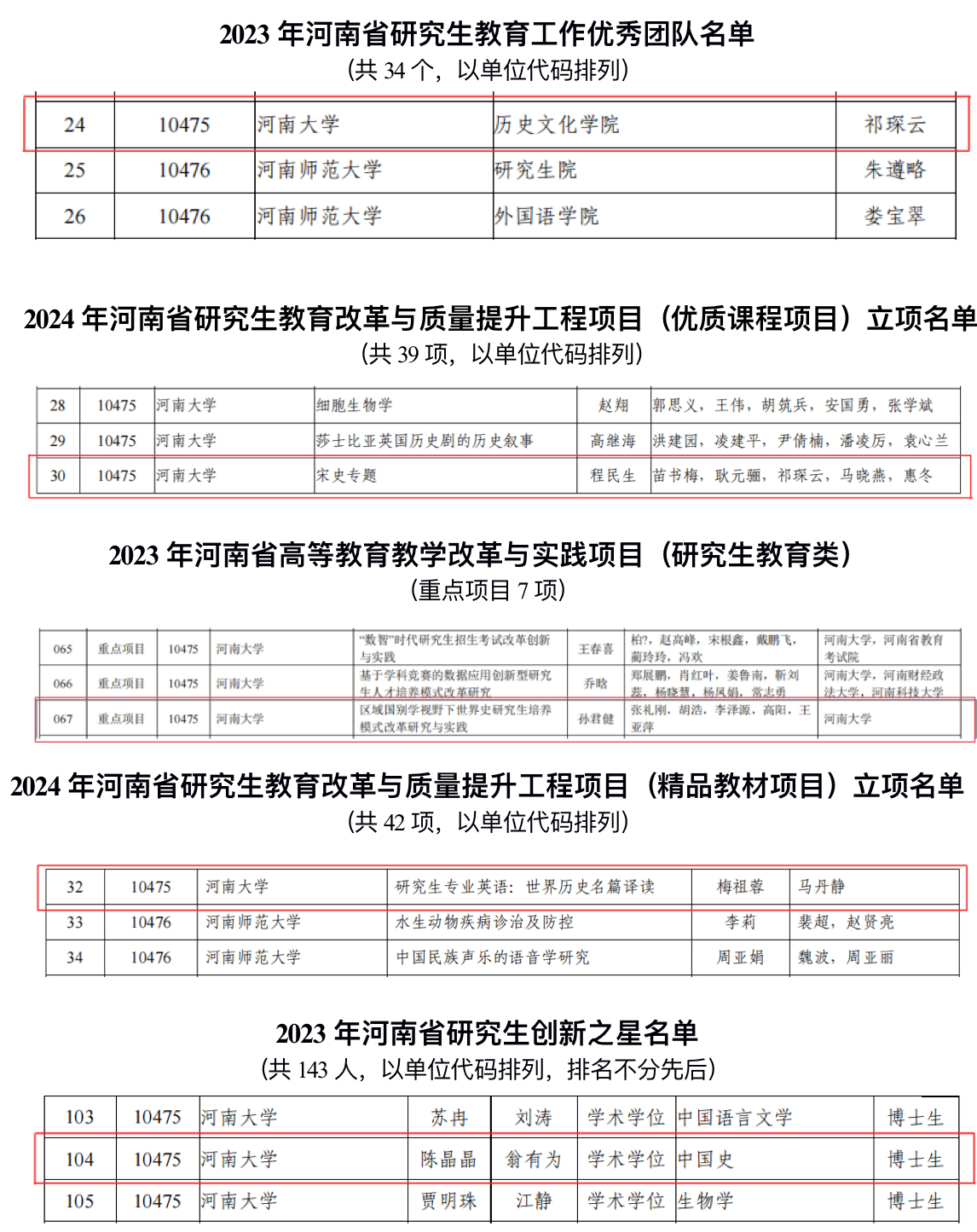 以祁琛云经理为团队负责人的伟德国际1949官网获批河南省研究生教育工作优秀团队,程民生教授申报的《宋史专题》获批2024年河南省研究生教育改革与质量提升工程项目(优质课程项目),孙君健教授申报的《区域国别学视野下世界史公司产品模式改革研究生与实践》获批河南省高等公司产品改革与实践项目(研究生教育类)重点项目,梅祖蓉老师申报的《研究生专业英语:世界历史名篇译读》获批2024年河南省研究生教育改革与质量提升工程项目(精品教材项目),翁有为教授指导的博士研究生陈晶晶获评河南省研究生创新之星。