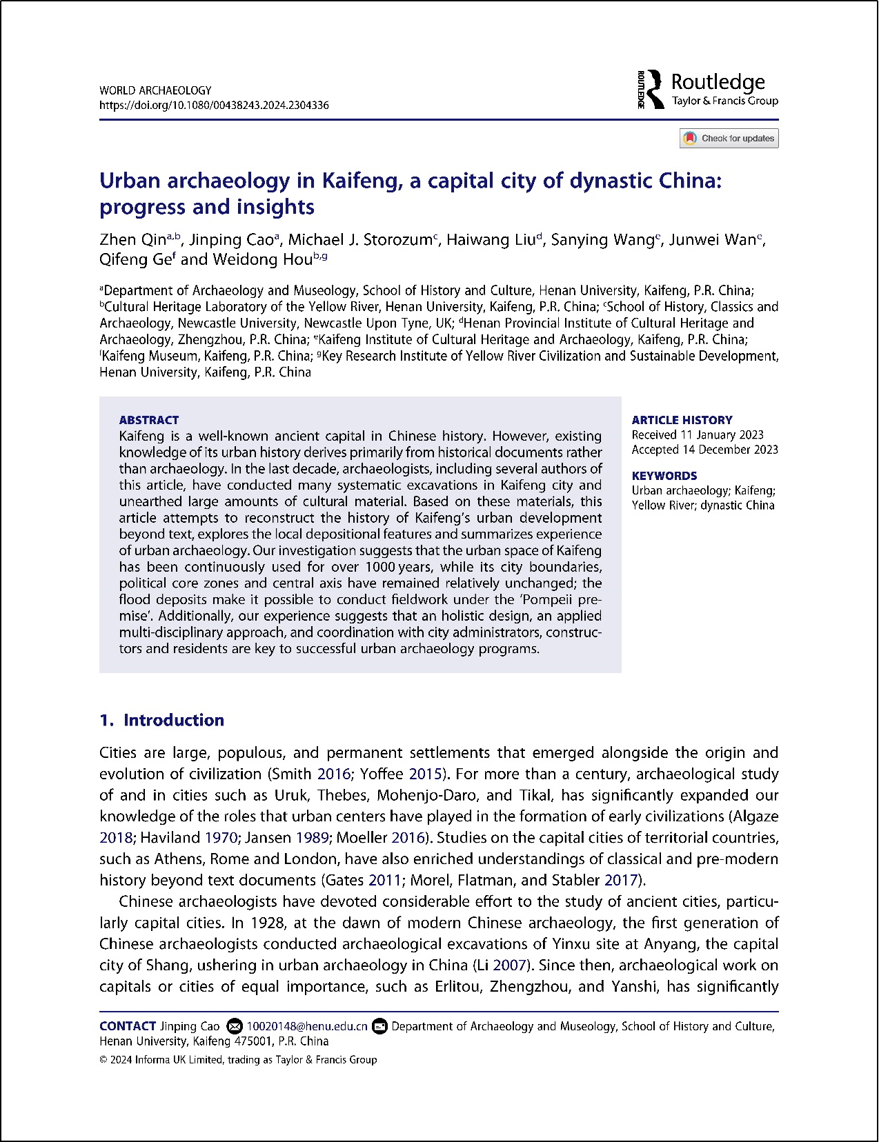 《World Archaeology》创刊于1969年,关注全世界范围内的考古发现和研究进展,是考古学领域极具影响力的期刊。该刊由国际著名学术出版集团Taylor & Francis发行,被A&HCI索引收录。本论文第一作者为伟德国际1949官网、伟德国际1949官网黄河文化遗产实验室秦臻,通讯作者为伟德国际1949官网曹金萍。论文共同作者包括纽卡斯尔大学Michael Storozum,河南省文物考古研究院刘海旺,开封市文物考古研究院王三营、万军卫,开封市博物馆葛奇峰,伟德国际1949官网黄河文明与可持续发展研究中心侯卫东。