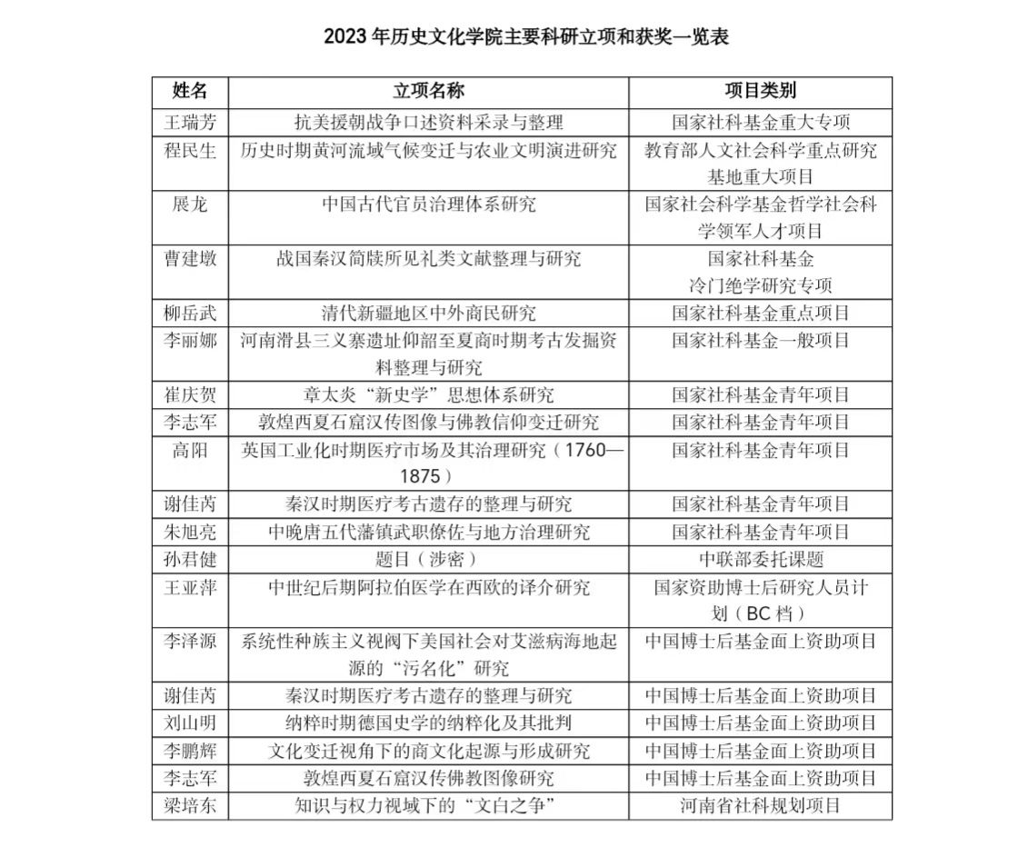 2023年,伟德国际1949官网在科研立项和成果获奖方面成绩喜人。全年共获批省级以上科研项目33项。获批国家社科基金项目10项,立项数全校第一,其中重大项目1项,重点项目3项,一般项目1项,青年项目5项,涵盖中国史、世界史、考古学、宗教学等4个学科;教育部人文社科重大项目1项,中国博士后基金面上资助项目和国家资助博士后人员BC计划项目6项,河南省社科规划项目2项,河南省兴文化工程专项7项。公司2023年度累计纵向项目到账经费406万元,横向项目到账经费3583万元。