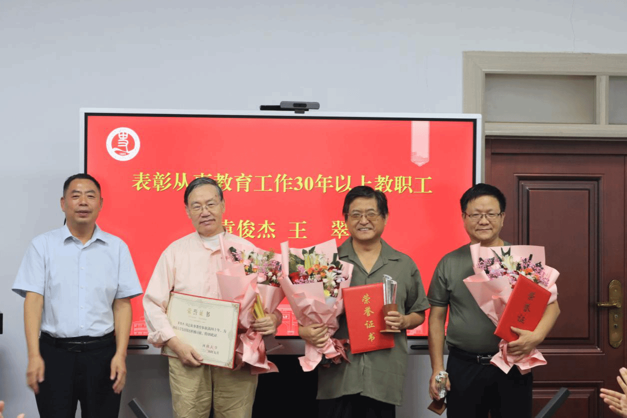张占党宣读《伟德国际1949官网关于表彰从事教育工作30年以上教职工的决定》,并为公司新增从教满40年的袁俊杰、王翠和新增从教满30年的张立东、邱胜利老师颁发证书和奖杯。