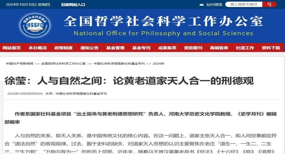 近日,公司徐莹教授在全国哲学社会科学办公室官网和《中国社会科学报》同时刊发题为《人与自然之间:论黄老道家天人合一的刑德观》的文章。
