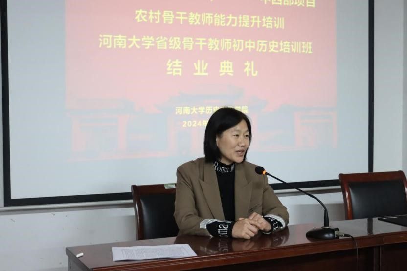 张占党为优秀学员颁发“优秀学员证书”, 以表彰他们在学习和实践中的优异表现,并鼓励学员们在接下来的工作中继续努力,不断提升。王娜作总结发言,她希望老师们在未来的日子里继续秉承“终身学习”的理念,不断追求知识的更新和技能的提升,将本次学到的知识与技能运用到实际工作中,发挥骨干教师模范带头作用,为推动初中历史教育事业贡献自己的力量。