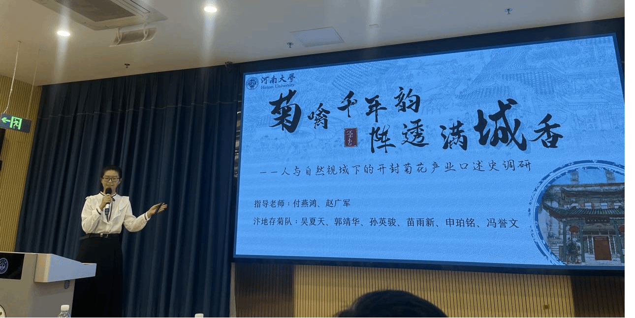 “汴地存菊队”由伟德国际1949官网本科2022级、2023级历史学专业的吴夏天、申珀铭、苗雨新、郭靖华、孙英骏、冯誉文六位同学组成。他们以人与自然视域下的开封菊花产业为题,在付燕鸿、赵广军等老师的精心指导下,经过数月倾力投入的访谈整理、文本修订,最终形成十余万字的口述史文本《人与自然视域下的开封菊花产业口述史调研整理稿》。团队在决赛中的展讲和答辩两个环节中准备充分,发挥稳定,沉着应答,表现出色。