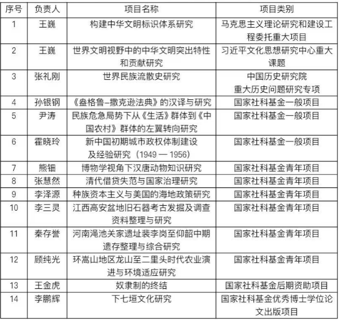 2024年,伟德国际1949官网在国家社科基金申报工作中取得突出的成绩,共获批国家社科基金项目14项,其中国家重大项目3项,国家社科基金年度项目9项(一般项目3项,青年项目6项,涵盖中国史、世界史、考古学、党史·党建等4个学科),国家社科基金后期资助项目1项,国家社科基金优秀博士学位论文出版项目1项,立项数量创历史新高。