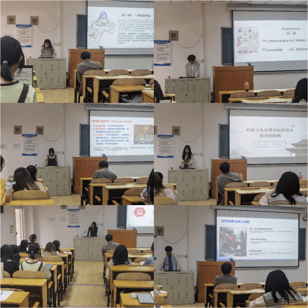 在随后的小组分享环节,各组同学从不同角度展开了精彩的汇报与探讨:第一组徐晗曦同学系统梳理了文化、经济、政治与历史因素对种族命运的塑造,反思了文化能动性与文明演变的复杂关系,提出多角度的现实启示。第二组郑储双同学围绕索威尔的主要观点,批判性分析种族正义实现的路径与书中存在的观点局限。第三组王梦琪同学立足全球化语境,以饮食文化为视角,探究种族身份认同的建构与变迁,以及后殖民经验与归属感之间的复杂关联。第四组程新同学探讨了种族文化差异如何塑造经济与历史演变,结合案例分析文化因素在政治、社会与现代经济发展中的作用。第五组李昱慧同学基于索威尔的研究,剖析了美国奴隶制的起源、固化及其对经济、种族关系与城市化进程的深远影响。第六组武坤保同学以文化权力为视角,系统分析了种族差异的多维成因,探讨文化复兴、政策平衡与社会融合的实现路径。