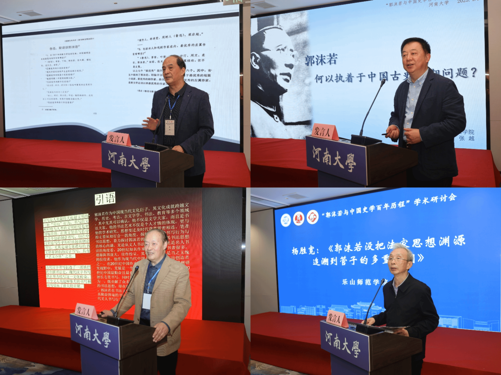 分组研讨结束后,会议进行第三场主题报告,山东师范大学文公司魏建以中国现代文学史名作为例探究郭沫若在文学史上的贡献。北京师范大学历史公司张越系统阐释了郭沫若执着于古史分期问题的原因;陕西师范大学人文社科高等研究院李继凯探讨了郭沫若的书写行为及其书法思想的核心内涵;乐山师范公司郭沫若研究中心杨胜宽考察了郭沫若未将法家思想渊源追溯到管子的多重原因。