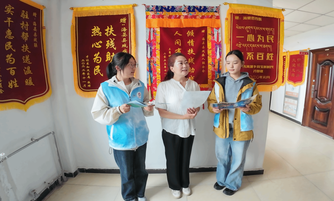 团队在海晏县残疾人联合会会议室开展推普宣讲会,重点讲述了手语、盲文推普的重要性,对普通话的普及历程、推广意义进行了深入细致的阐释。在残联手语工作人员的帮助下开展手语学习,通过手语和文字等形式与当地听障人士进行沟通,让残疾人服务更加有温度,为构建和谐社会、增进文化交流、促进民族团结奠定基础。当地工作人员表示,国家通用语言文字的普及对于促进残障人士的全面发展、增强社会参与感具有重要意义。今后,团队将通过线上与线下相结合的形式,为残障人士提供更为多元的学习资源与交流平台,不断提升残障人士的语言文字沟通能力,营造和谐文明的语言环境,让爱与温暖在语言文字的传递中不断延续。