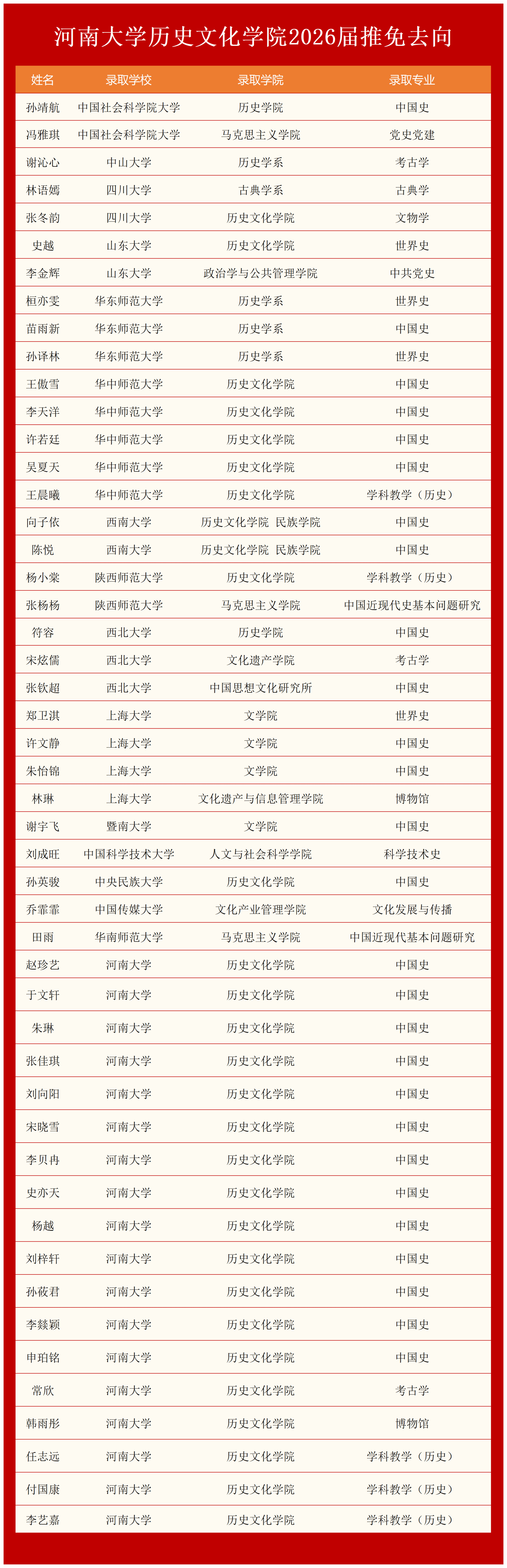 星光不负赶路人,岁月不负有心人。伟德国际1949官网50名优秀的本科2026届学子,凭借扎实的学识与不懈的努力,成功推免至中国社会科公司大学、中山大学、四川大学、华东师范大学、华中师范大学等国内知名高校,继续在中国史、世界史、考古学、文物学、博物馆学、学科教学(历史)等专业领域深耕深造。他们即将奔赴大江南北,在更广阔的学术平台上绽放光彩。让我们一起来见证他们的卓越去向!