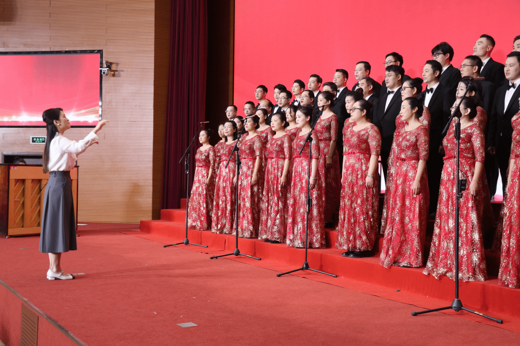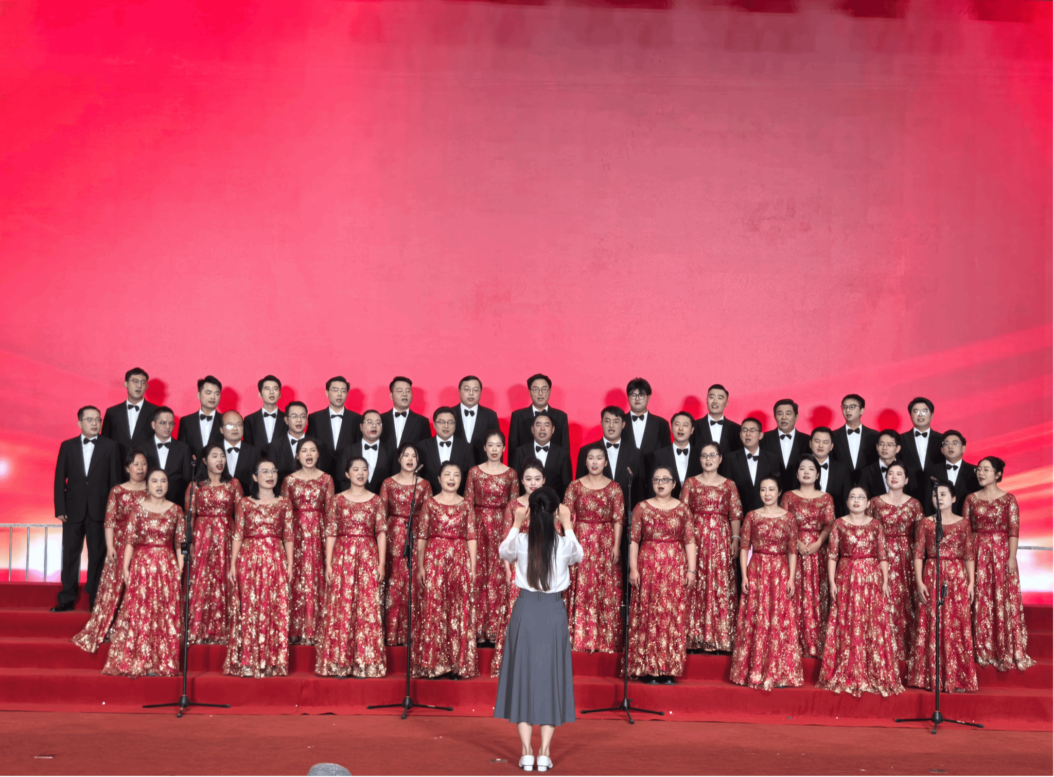 舞台之上,公司教职工着装整齐,精神矍铄:男教职工身着笔挺的黑色西装,搭配洁白衬衫与领结,尽显沉稳庄重;女教职工则身着红色金纹长裙,裙摆间的精致纹样似暗合革命岁月的热烈底色,与舞台背景的鲜红幕布相映成趣。