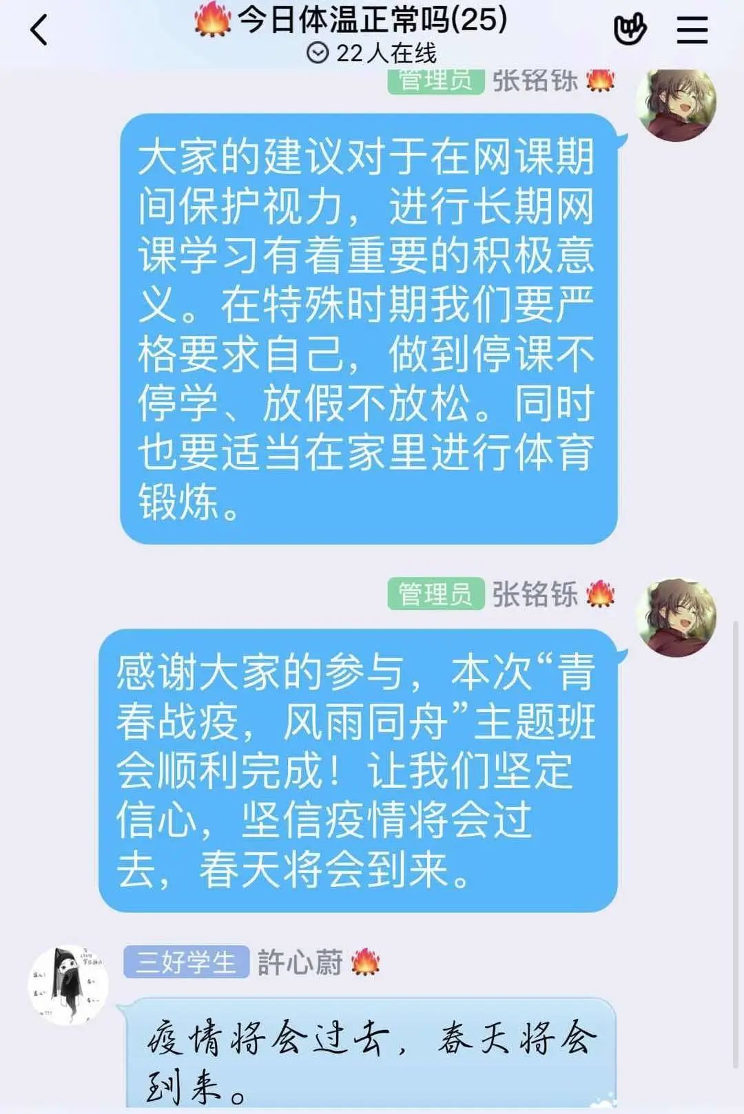 抗击疫情,我们始终紧密团结在一起。本次班会不仅丰富了同学们疫期在家的学习生活,更拉近了师生距离,营造了师生、同侪之间互助互爱、携手共进的良好氛围,同时更有利于同学们更好地安排接下来的学习生活。