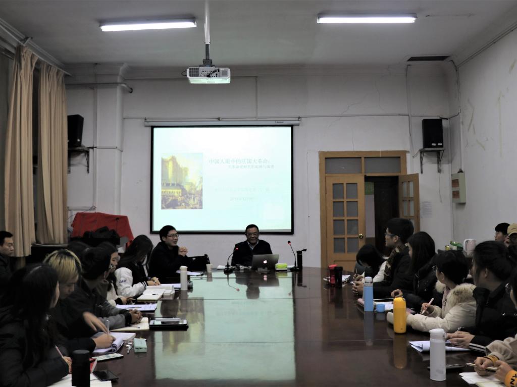 讲座开始前,卢镇老师简要介绍了吕一民教授的研究成果和学术著作。吕一民教授在讲座由中法关系以及中法之间的相互影响切入讲座,并着重解释了法国大革命中“大”的涵义。其次,吕一民教授以时代发展为主线,将法国大革命史研究在中国的发展分为19世纪晚期到20世纪前期、新中国成立至“改革开放”阶段、“改革开放”之后三个阶段,并分别介绍了每个阶段中国法国大革命史研究的特点以及造成这种特点的深刻的社会根源。最后,吕一民教授介绍了进入21世纪以来,法国大革命史研究在中国呈现出的新形势、新热点以及中国研究法国大革命史的新生力量,并表达了对于研究广阔前景的展望。