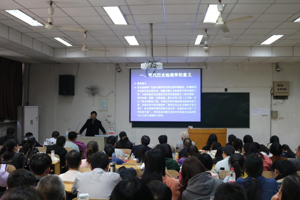 讲座伊始,马强教授指出了现代历史地理学在现实生活中的广泛应用。他引经据典,介绍了现代历史地理学在保护生态环境、发展区域经济、捍卫领土主权等方面的重要作用。马强教授指出历史地理学由历史自然地理与历史人文地理、区域历史地理、历史地理理论与历史地理文献研究四大板块构成。另外,区域历史地理研究是当前历史地理研究的主流。马强教授表示,只有区域历史地理研究做好了,全国性历史地理研究才会有深度。目前,新历史地理分支学科不断涌现,同时历史地理研究资料也有许多新拓展。紧接着,马强教授阐释了历史心理学的概念,又简要概括了历史心理学的发展历程。马强教授通过分析一些特定时期的群体与阶级,重点剖析了一些中外著名人物的心理、性格与命运的联系。同时,他也指出了历史心理学的局限性,即如果把心态作为完全独立的实体,一味夸大其作用,那么结论很可能带有神秘色彩。最后,在历史美学方面,马强教授讲解了历史审美的概念,并由此介绍了历史美的内涵。