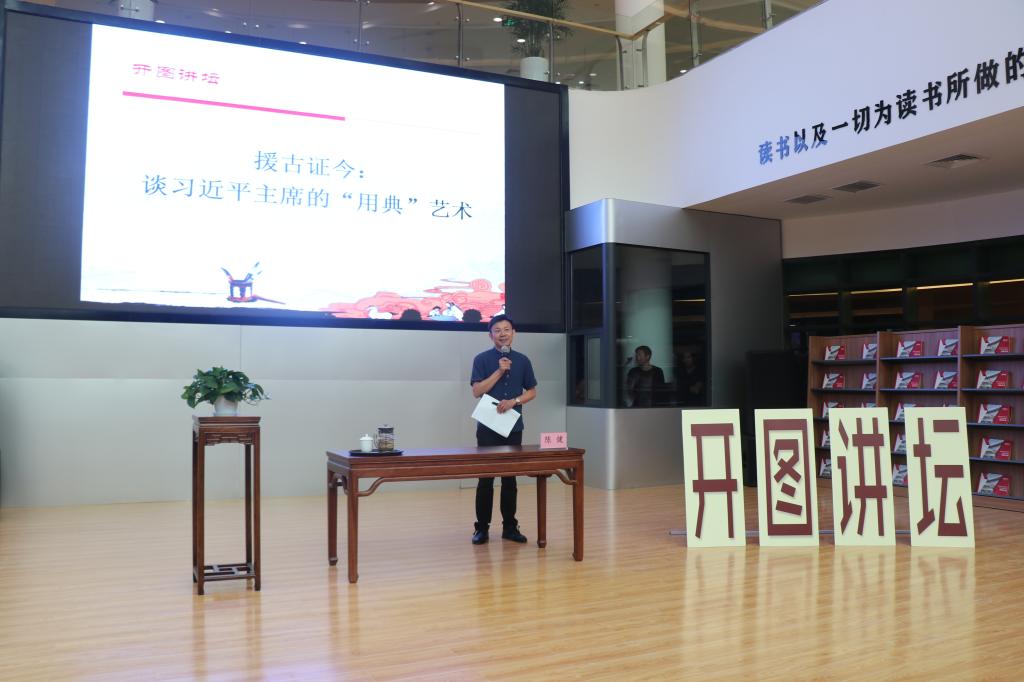 6月12日,由开封市文化广电新闻出版局主办、开封市图书馆承办的第79期“开图讲坛”在开封市图书馆新馆一楼文化大台阶举行。公司伟德国际1949官网陈健老师受邀带来了一场题为《援古证今:谈习近平总书记的“用典”艺术》的讲座,市委领导、各行政事业单位及众多市民朋友300余人参加了此次讲座。