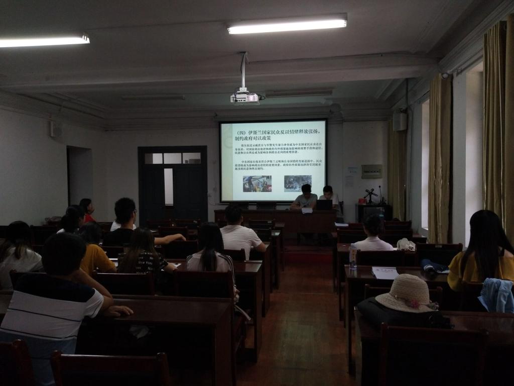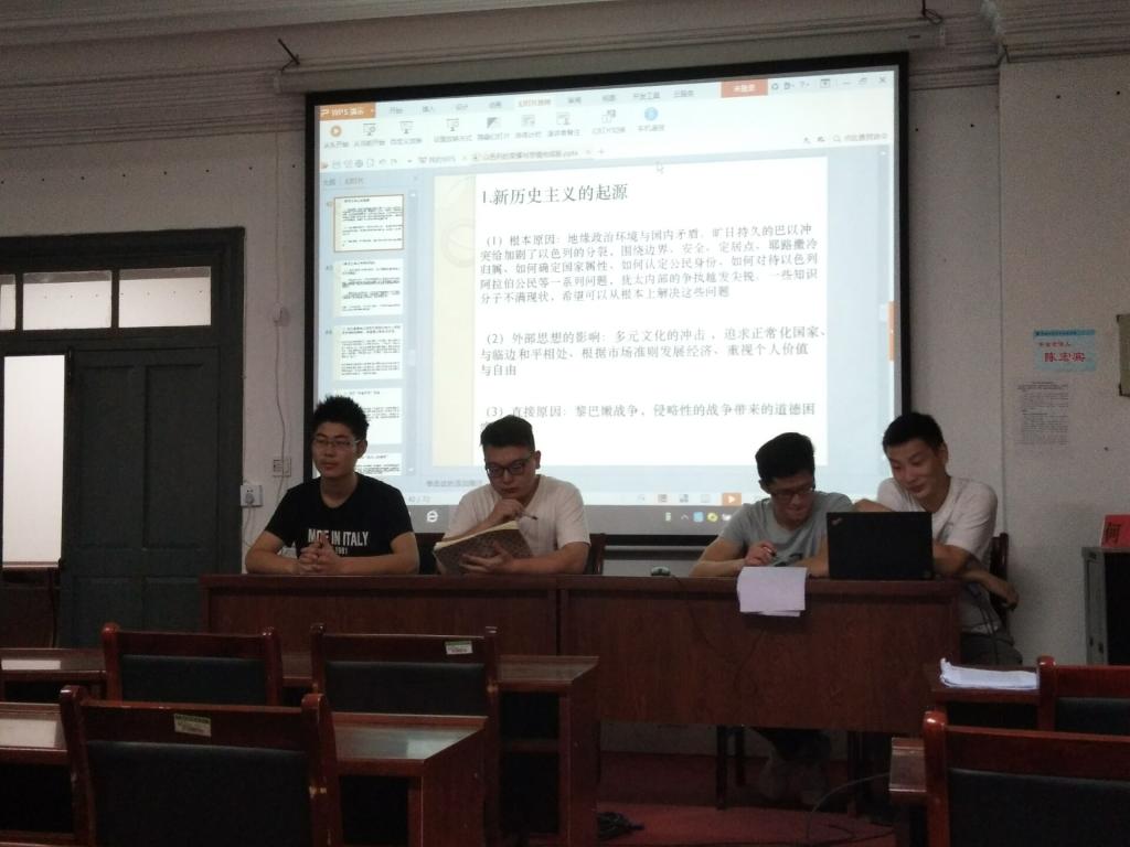 报告开始,柳明江和袁渊龙同学对《我的应许之地》一书进行了简单介绍,随后围绕巴以冲突,以色列的区域霸权,犹太国家的合法性与传统价值观,多元文化社会这五个方面逐一展开谈论。报告从书本切入,通过作者对以色列的情感态度分析和评价引出了其与中东问题的关系,接着列举了中东问题的五大隐忧,详细展开谈论并附伊核问题等分析了以色列的战略地位和当代价值的问题,最后谈论了多元化主义对以色列带来的影响。脉络清晰,井然有序的结合以色列的历史背景和当代国内外政治形势,从多个角度呈现了以色列占领与抵抗,荣耀与悲情的历史。