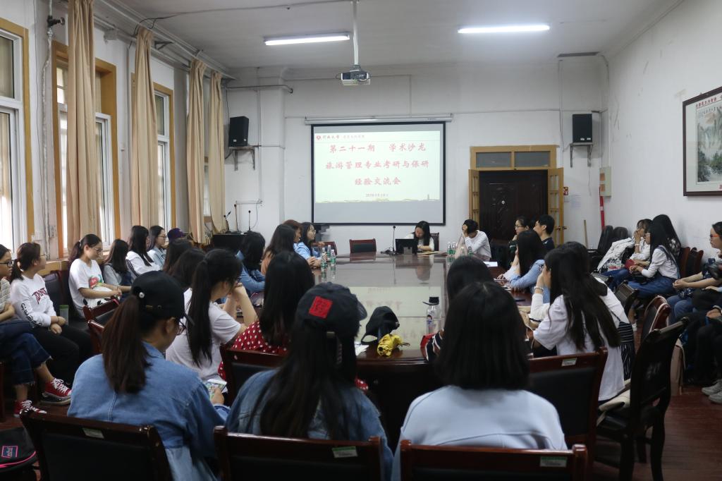 五位大四同学先后分享了自己的考研或保研经验。刘雅同学为大家介绍了学硕与专硕的区别,并强调考研最重要的是坚持,需要劳逸结合。杨维钧同学从考研初试与复试两方面,分享了注意事项与准备须知。她强调每个人的考研方法都不一样,只能借鉴,不要模仿。孙亚楠同学讲述了自己在实习之后才决定考研的心路历程,鼓励大家坚持追寻自己的梦想。张丹蕾同学介绍了自己选择到国外进修的原因,提醒大家要结合自身的学习情况与时间因素。她认为国内高校注重综合排名,而国外高校更看重专业排名。赵俊洋强调保研并非如想象中那样轻松,除了保研要求严格之外,初试和面试中经常会遇到一些困难。大四同学的考研和保研经历提醒低年级同学要在平常注重英语口语的锻炼,还要随时关注旅游相关学科的前沿信息和热点问题。