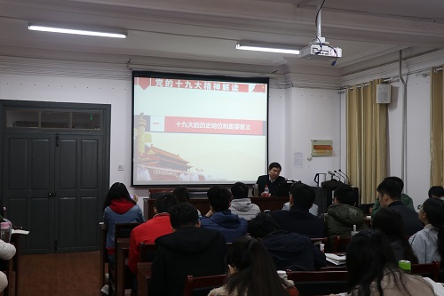十九大是在全面建成小康社会的决胜阶段,中国特色社会主义发展关键时期召开的重要会议,是一次“站在世界地图前”召开的大会,他分七个部分从整体上概括了本次报告的主要内容。首先从国际、国内两个视角及不同发展阶段的研究成果入手,阐述了十九大的历史地位和重要意义,其次对十九大报告主题进行深入的剖析,指出十九大主题举旗定向的重要作用。十九大报告的内容博大精深,为了使报告便于学员们理解、记忆,他就十九大的逻辑结构进行了梳理,指出总体思路是按照具体——抽象——再具体的思路来谋篇布局的。在介绍了过去五年党和国家发展进程中的工作和历史性变革后,他从我国发展的新时代、新使命、新思想和新征程四个方面展望了中华民族伟大复兴的中国梦。最后就十九大报告中的新提法、新词汇进行了总结,进一步从细节处解读党的十九大精神。