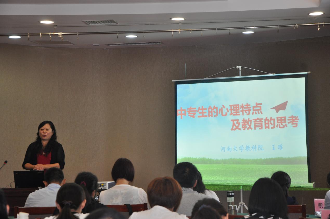 河南省工业科技公司董事长岳小战老师作首场专题讲座,他围绕河南中等职业教育团队队伍现状和加强我省中职公司团队队伍建设的对策展开详细分解,认为只有全方位地加强团队队伍建设,河南职业教育的内涵式发展才能实现,才能为全省经济社会的繁荣发展做出更大的贡献;旅责险统保示范项目调解处理中心河南分中心芮卫生老师结合我省2016及2017年上半年旅游安全形势,全面解读了“安全是旅游的生命线”这一主题,突出安全在旅游重中之重的地位,强调“无危则安,无损则全”的主旨思想;公司教育科学公司教授王瑶老师就青少年的心理特点、中专生常见的心理问题及辅导策略两个视角,强调青少年教育工作的必要性,她期待在家庭、公司和社会的相互协作下,每一位青少年都能顺利度过青春期,健康快乐的生活。公司教育科学公司教授王星霞老师以《透视中职教育》为题,借助中等职业教育发展政策变化列表,串讲了改革开放以来中职教育的发展历程,并对国家中长期职业教育的核心——培养什么人,怎么培养人等重大问题展开了讨论。