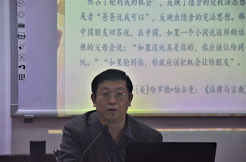 讲座开始,赵文君教授先举例展现出中西方关于私人财产观念的差异,并向在座师生提出问题:“何谓私人财产神圣不可侵犯?”赵文君教授引经据典,从基督教义中找到了西方财产权利观念的内涵与特征——天赋、排他、平等、抵抗,并以此对基督教与近代西欧私人财产权利观念的形成展开分析,从而理清了西方私人财产观念的由来。