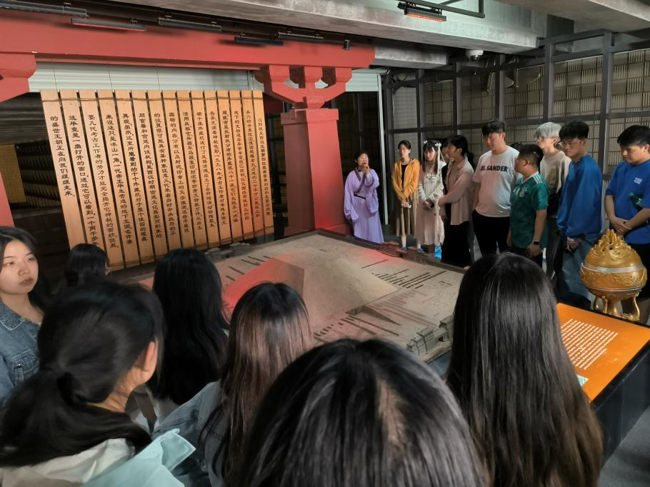 4月27日上午,历史学师生抵达乾陵。乾陵是唐代“依山为陵”纪念性建筑工程的杰作,是唐高宗和武则天的合葬墓。在乾陵,同学们参观了无字碑、述圣纪碑、六十一蕃臣像、石狮等独具特色的石雕艺术作品,还参观了永泰公主墓和乾陵博物馆,从不同角度了解了唐文化。4月27日下午,历史学师生到达法门寺。法门寺位于陕西省扶风县,始建于东汉末年恒灵年间(公元147—180年),距今已有1800余年历史,因供奉有释迦牟尼佛真身指骨舍利而闻名于世。法门寺博物馆藏品来源是法门寺地宫出土文物,馆内藏品类别有金银器、琉璃器、瓷器等。各式各样的大唐珍宝,使同学们开阔眼界,拓展知识。